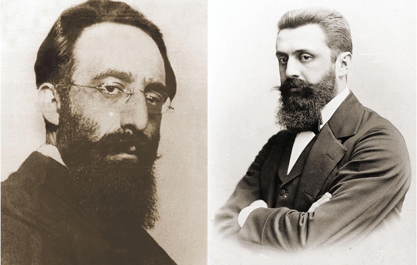 Nathan Birnbaum (a sinistra), scrittore e pensatore viennese che coniò il termine “sionismo” solo per poi rifiutarlo anni dopo, e Theodor Herzl , giornalista e avvocato austro-ungarico ampiamente considerato il fondatore del sionismo politico moderno. (A destra: Imagno / Getty Images)